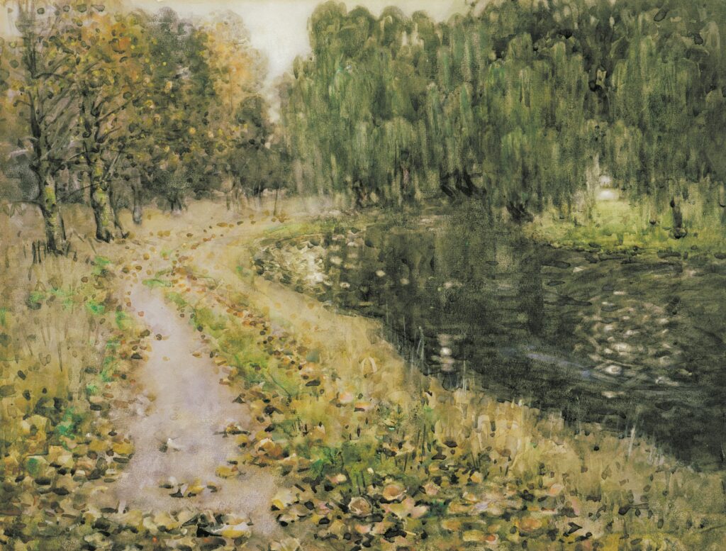 A peaceful landscape showing rural life and natural beauty with peasants in a scenic environment.